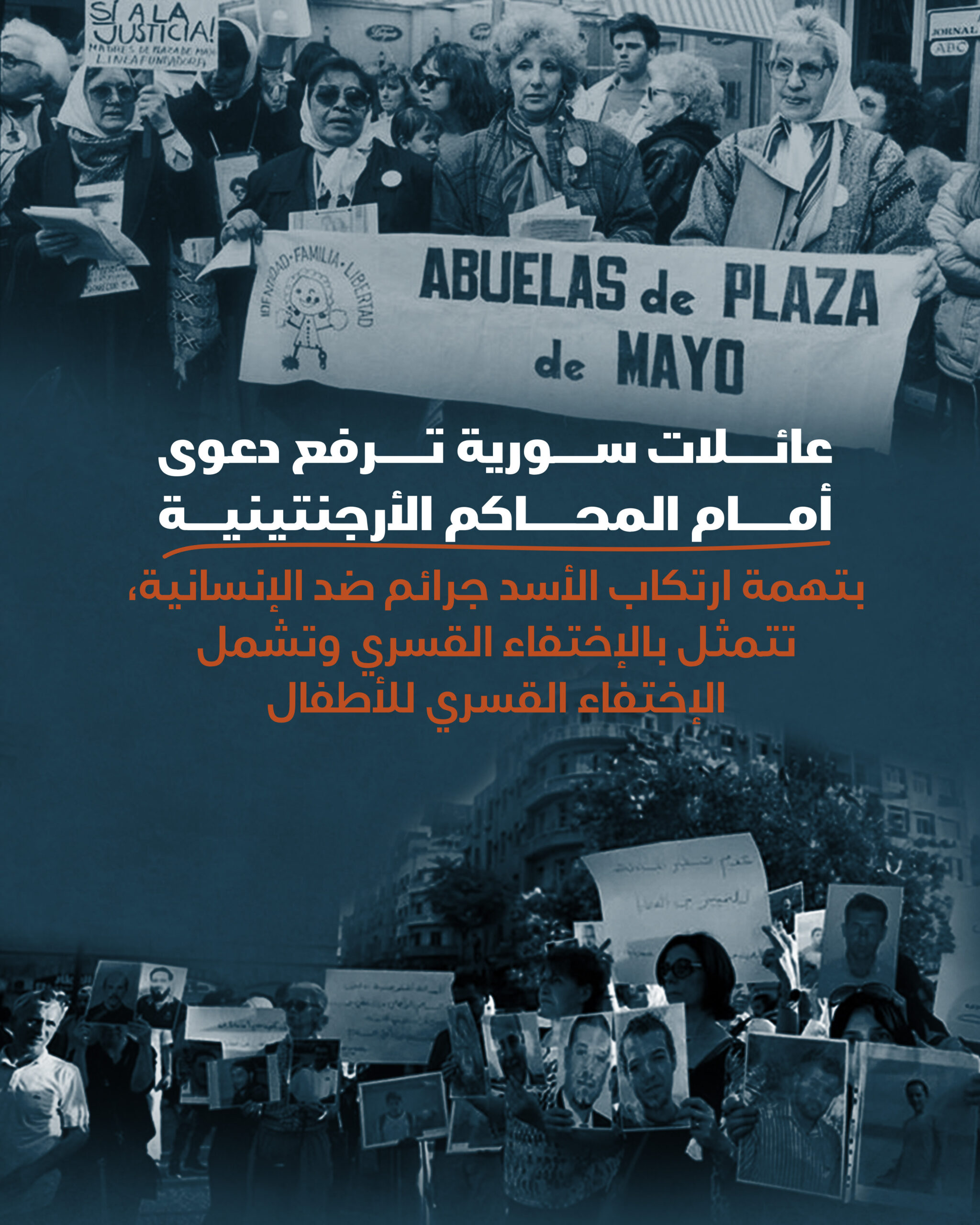 قدّمت عائلات وناجون من ميثاق الحقيقة والعدالة (TJC)، ورابطة معتقلي ومفقودي سجن صيدنايا (ADMSP)، والبرنامج السوري للتطوير القانوني (SLDP)، وبدعمٍ قانوني من Estudio Durrieu ومؤسستهم لضحايا الانتهاكات الدولية، شكوى جزائية ضمن نظام العدالة الفدرالي في الأرجنتين بتاريخ 5 كانون الأول/ديسمبر، طالبت بفتح تحقيق حول مسؤولية الرئيس السابق بشار الأسد، وأسماء الأسد، ومسؤولين بارزين في النظام السوري عن جرائم ضدّ الإنسانية تتمثّل في الاختفاء القسري. واليوم، تشرح المجموعات ما الذي تعنيه هذه القضية لمسار البحث عن الحقيقة والعدالة.